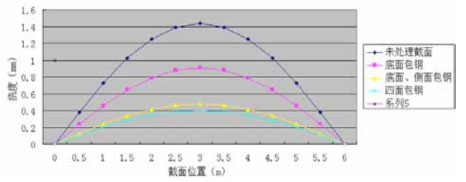 为合理选择粘钢方式,提高加固经济效益,采用静载试验梁的方式进行粘钢效果测试,测试试验梁长6m,矩形截面,高0.6m,宽0.3m,试验荷载下,梁体挠度对比如下图所示。